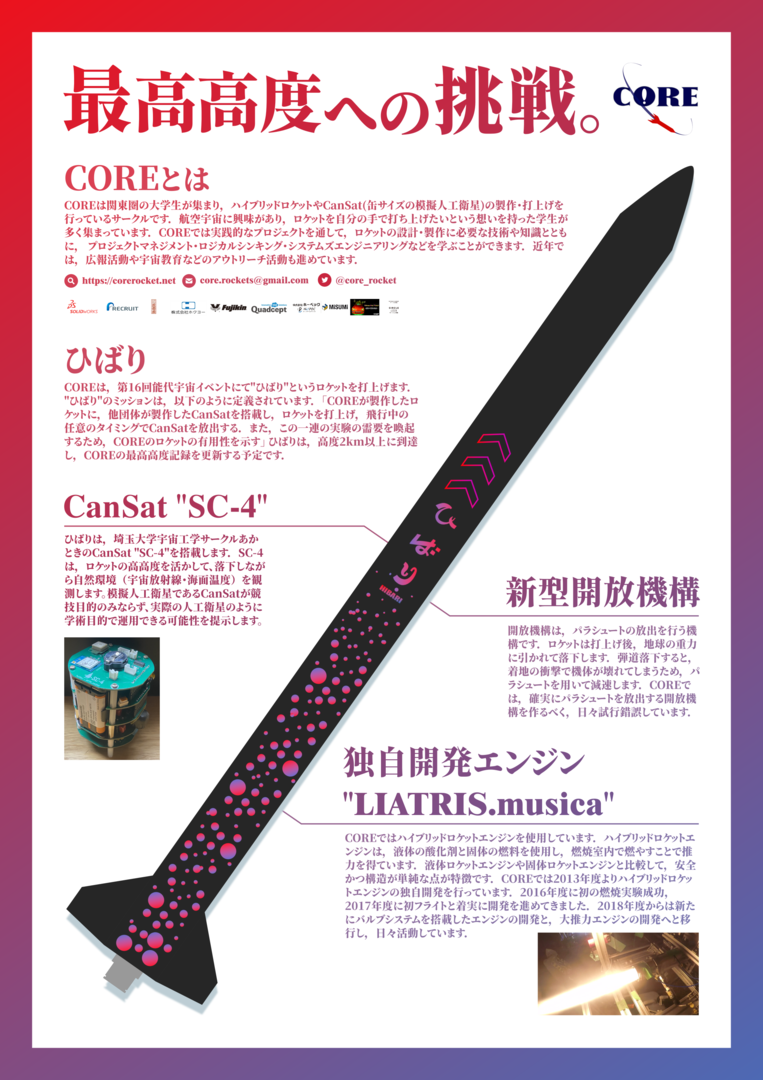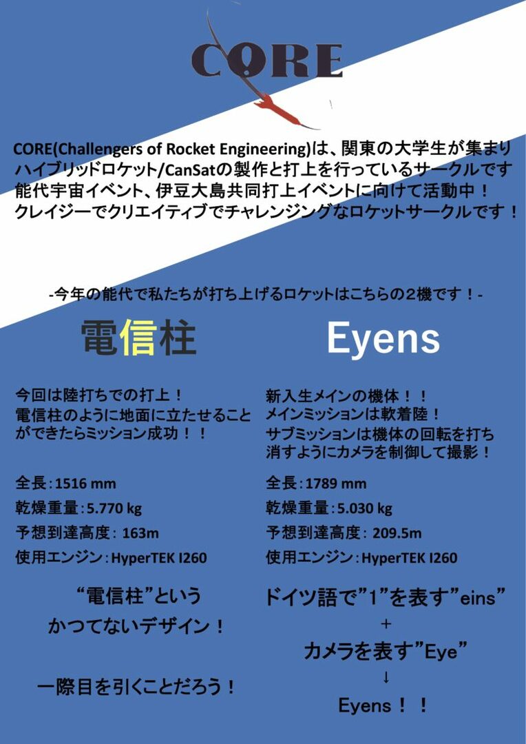 - 機体名:CORE #バルブ #ロケット #能代 #海打ち #高高度 #ロケッティア #点火点越しの私の世界 #ロケット好きと繋がりたい #CAN #リーフィング #rocket_hunter_jp #ババヘラ #自作エンジン #縦開放 #ロケットら部 #大学生 #きりたんぽ #fusion360 #OpenRocket #CFD #若気の至り #インカレ #3D プリンタ